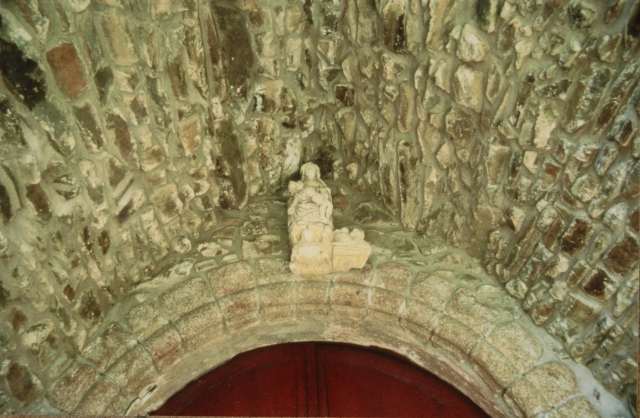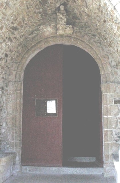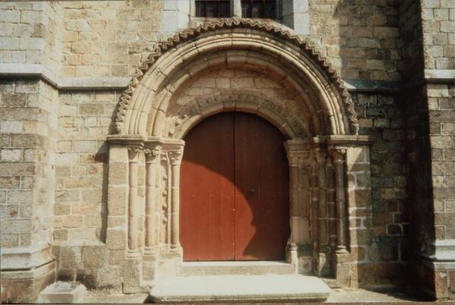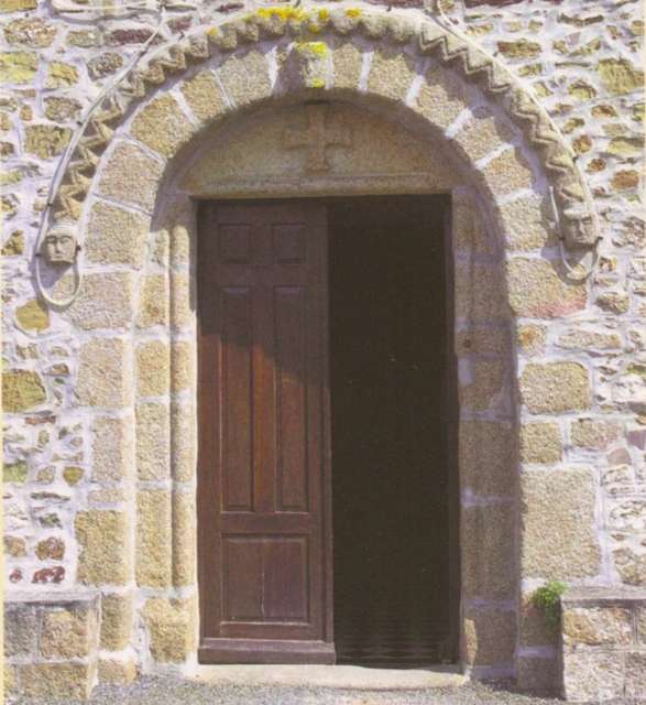 049. Yquelon. The Romanesque west gate. Its semi-circular arch is formed by a plain grain resting on plain abutments and surrounded by an archivolt. The archivolt is a prominent band adorned with saw-teeth in high relief carved with a hollow row of triangular sticks. Its two ends rest on a granite stone carved with a human head. The keystone of the arch is adorned with a human head in higher relief. The inside abutments are molded with a small column with a square abacus and base. These abutments support a tympanum in granite, which was restored and carved with a cross In Romanesque style in 1897. Photo by Claude Rayon. [Claude-13]