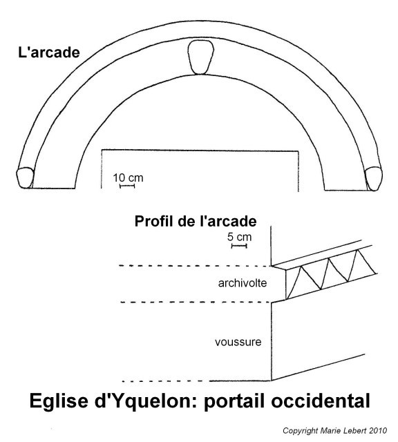 050. Yquelon. Sketch of the Romanesque west gate. This gate has similarities with the south gate in the church of Bréville, located a few kilometers north-west. Sketch by Marie Lebert.