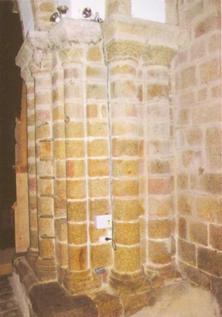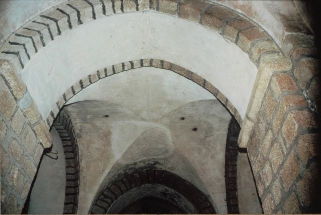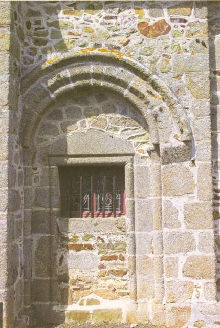 092. Saint-Jean-le-Thomas. The pre-Romanesque choir. On the left of the large central bay, a small Romanesque bay is clearly visible, with its centering and abutements in granite. Photo by Claude Rayon [Claude-31]