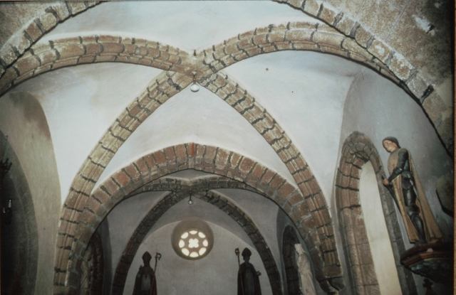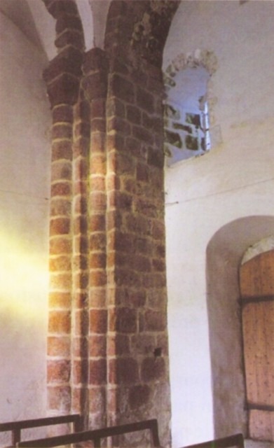 173. Saint-Léonard-de-Vains. The base of the Romanesque tower. Inside, the tower rests on massive piers. Photo by Claude Rayon. [Claude-53]