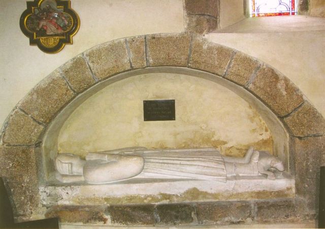 059. Yquelon. The enfeu and its tombstone. In the north wall of the nave, an enfeu (recess for a tombstone) with a lowered centering houses a 12th-century tombstone in soft limestone depicting a knight. Mr Lomas described it in a journal named Bulletin of the Society of Antiquaries in Normandy (Bulletin de la Société des Antiquaires de Normandie) dated 1886-1887: "The tombstone bears a knight in relief, depicted with his hands clasped, his head resting on a pillow, and his greyhound at his feet. (...) It bears no indication of his name or no indication of a year. It is therefore impossible to specify the person whose remains are covered. What we can say with certainty is that this person belongs to the powerful family of Yquelon, whose family member Roger Yquelon affixed his signature on two main charters of the Abbey of the Lucerne in 1162." Discovered in 1885 in the cemetery adjoining the north of the church, the tombstone was embedded in the enfeu in February 1893. At the length of the enfeu, 2.15 meters, is exactly the length of the tombstone, we can guess the tombstone was probably buried in the cemetery at the time of the French Revolution, before being discovered in 1885 and regaining its original location. Photo by Claude Rayon. [Claude-17]