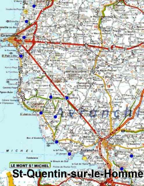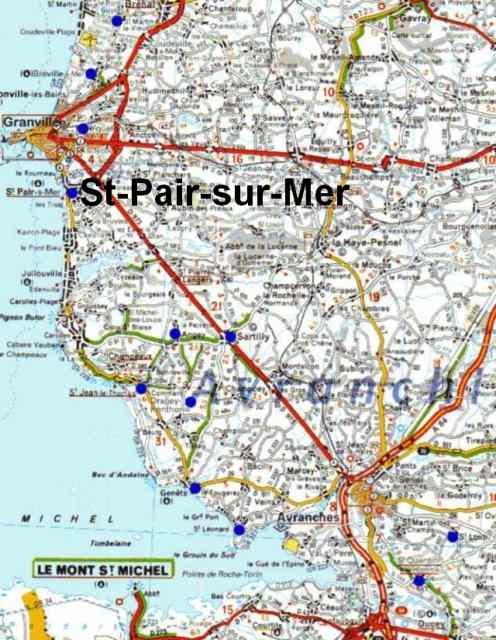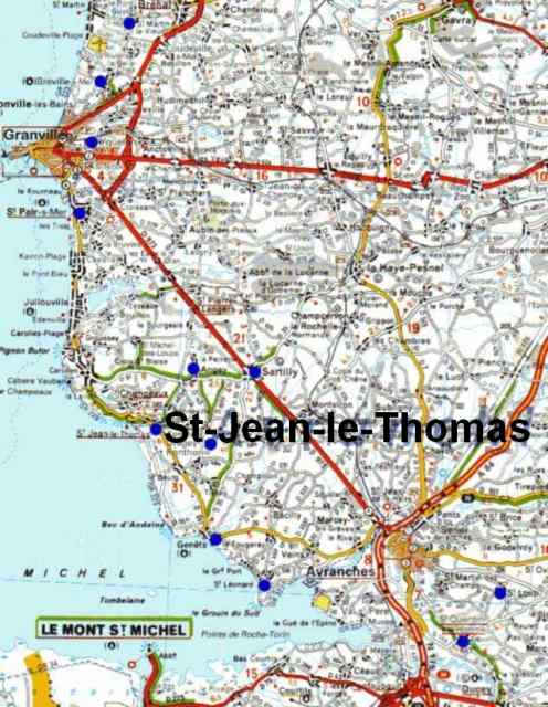 086. Saint-Jean-le-Thomas. Location. The village of Saint-Jean-le-Thomas is located on the coast, 12 kilometers south of Granville and 9 kilometers north of Avranches. Saint-Jean-le-Thomas was situated on two medieval roads, the first one coming from Saint-Pair-sur-Mer and the second one coming from Coutances. Another shore road going from Saint-Pair to Mont Saint-Michel was crossing the dunes nearby.