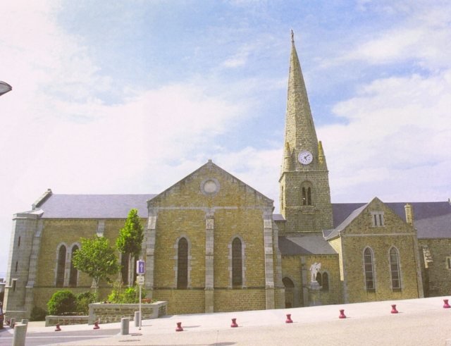 061. Saint-Pair-sur-Mer. The church is under St. Pair's patronage, and the second saint is St. Gaud. The church is a place of pilgrimage dedicated to the worship of St. Gaud, whose sarcophagus was found in 1131 during the building of the Romanesque church. Much later, in 1880, the Romanesque nave was demolished to be replaced by a much larger nave and a transept to accommodate the many parishioners of this popular seaside resort. The enlarged church was consecrated on August 26, 1888. Photo by Claude Rayon. [Claude-18]