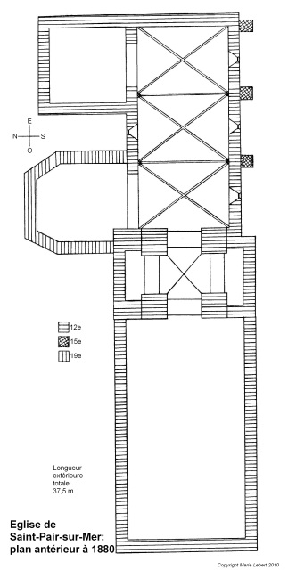 064. Saint-Pair-sur-Mer. The church plan before 1880, as we can imagine it. The total external length was 37,5 meters. The external width of the nave was 11,1 meters (this hasn't changed). Plan by Marie Lebert.
