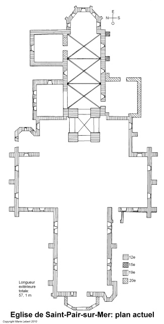 065. Saint-Pair-sur-Mer. The plan of the present church. Regulary oriented from west to east, the building has a two-row nave with a porch, a large transept and a three-row choir with a semi-circular apse. The external length of the whole building is 57,1 meters. The external width of the nave is 11,1 meters. The square tower rises at the crossing of the transept. The transept arms are opened by two apses on their eastern side. The choir opens north on two chapels, one towards the apse and one towards the tower. At the angle formed by the south transept arm and the choir, a rectangular building houses the sacristy. Plan by Marie Lebert.