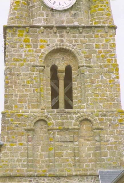 140. Genêts. The tower is situated at the transept crossing, with two floors. It is Romanesque to two-thirds of his height, with blocks of granite of medium size, while the top is from the early 16th century, with much larger blocks of granite. The lower floor is blind. The upper floor is open to the north, south and west by walled-up Romanesque twin bays, that were extended by Gothic trefoil bays added in the early 16th century. Photo by Alain Dermigny. [Alain-074]