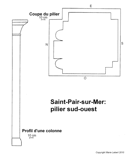 070. Saint-Pair-sur-Mer. Sketch of the south-western pier of the tower. This pier is as follows: east, west and south, it is salient. North, an attached pier surrounded by two attached columns rests on a stoneboard. Molded as a champered band, the impost topping the pier forms the abacus of the capitals of the two columns. The capital baskets are carved, with a square base topped by a chamfer. The pier rests on a broader square base with chamfered edges. Sketch by Marie Lebert.