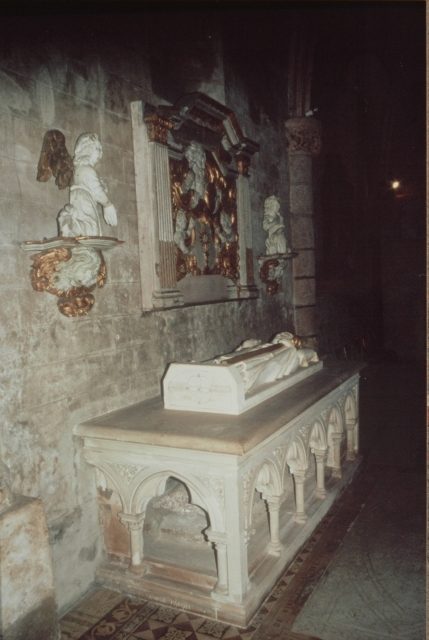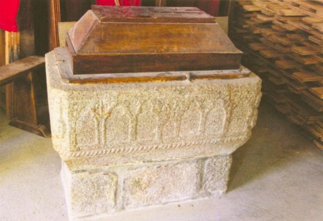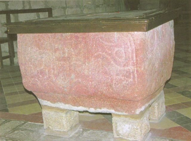 074. Saint-Pair-sur-Mer. St. Pair's sarcophagus. A stone altar dating from the 19th century covers the shell limestone sarcophagus of St. Pair. St. Pair (482-565) founded a chapel with St. Scubilion, the foundations of which are still present underneath the choir of the present church. St. Pair also gave his name to the village previously known under the Roman name Scessiacus, or Scissy. St. Pair and St. Scubilion's sarcophagi were found in 1875, during the excavations made by abbot F. Baudry. Photo by Alain Dermigny. [Alain-040]