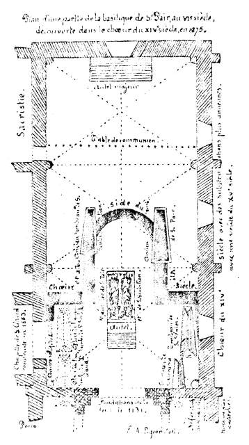 075. Saint-Pair-sur-Mer. The plan of the oratory sketched by abbot F. Baudry. In September 1875, during excavations in the church choir, abbot F. Baudry found part of the foundations of the 6th-century oratory and several shell limestone sarcophagi: the sarcophagi of St. Pair and St. Scubilion and, nearby, those of St. Senier and St. Aroaste. St. Gaud's sarcophagus was found in 1131 while digging the foundations of the Romanesque tower. This plan is included in the book of Chanoine Pigeon entitled "Vie des Saints du Diocèse de Coutances et d'Avranches" (Life of the Saints in the Diocese of Coutances and Avranches), published in Avranches in 1888.