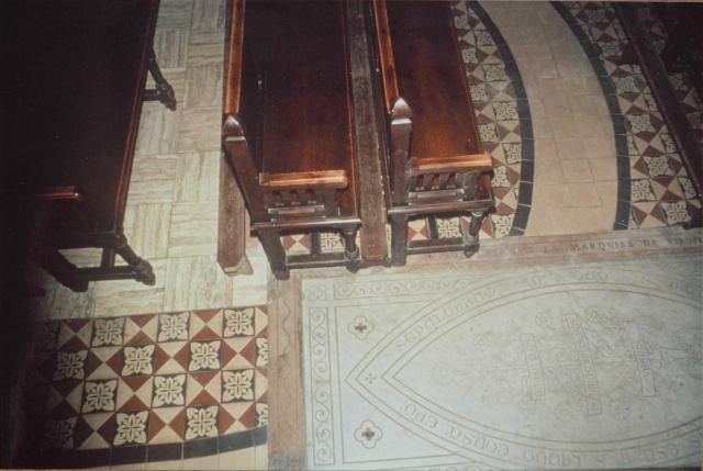 076. Saint-Pair-sur-Mer. The foundations of the oratory. On the floor of the second row of the present choir, the double line of black tiles surrounded by a row of clear tiles shows the exact place of the foundations of the old oratory. The underneath foundations form a semi-circular apse going on as side walls that disappear in the Romanesque building. Fortunatus (530-600), bishop of Poitiers, wrote in his "Vie de Saint Pair" (St. Pair's Life) that the cells of the early monks were built beside the sea. Then monks move their dwellings on the banks of the river Saigue, at the site of the present church, attracting a population that settled around the oratory. In the foreground, a white gravestone shows the spot where St. Pair's sarcophagus was buried and discovered. Photo by Alain Dermigny. [Alain-042]