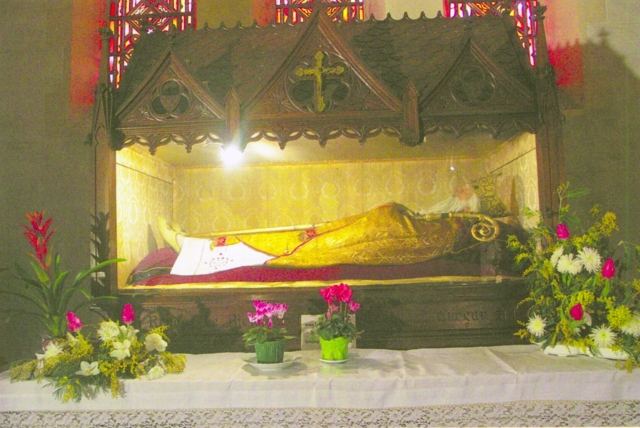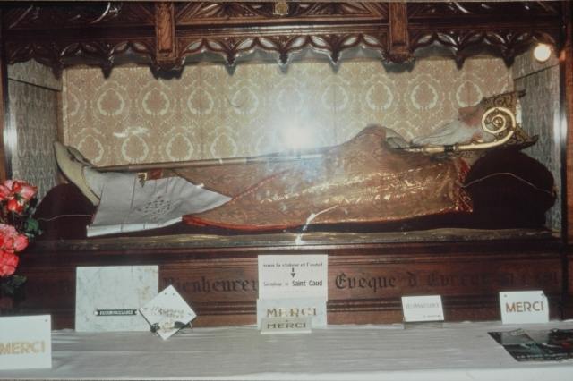 077. Saint-Pair-sur-Mer. St. Gaud's reliquary, on the altar covering his shell limestone sarcophagus. St. Gaud (400-491) has its own chapel, built in the 19th century in the north wall of the choir, the church being a place of pilgrimage dedicated to his worship. After fourty years as the second bishop of Evreux, St. Gaud resigned from office to come and retire in the solitude of Saint-Pair. St. Gaud's sarcophagus was found in 1131 while digging the foundations of the Romanesque tower. Photo by Alain Dermigny. [Alain-041]