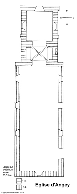 083. Angey. The church plan. Regularly oriented from west to east, the rectangular building is formed by a long nave and a one-row choir. The whole building has an external length of 26,85 meters and an external width of 7,5 meters (width of the front). The tower rises between choir and nave. Plan by Marie Lebert.