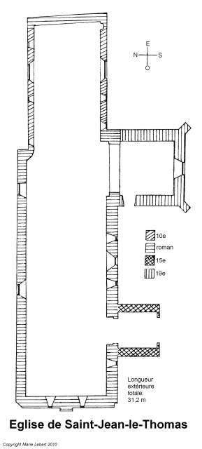 089. Saint-Jean-le-Thomas. The church plan. Regularly oriented from west to east, the rectangular building is formed by a long nave and a flat apse choir. The whole building has an external length of 31.2 meters and an external width of 8.1 meters (width of the front). The church gate is opened in the south wall of the nave, with a porch. Built along the nave, the tower rises south. Plan by Marie Lebert.