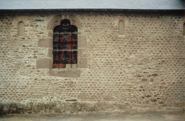 013. Saint-Martin-le-Vieux. The south wall of the Romanesque nave. The large bay with a lowered centering was probably added in the 16th century, during the building of the double belfry. On the right of this large bay, the centering of the small Romanesque bay is carved in a granite block. Photo by Alain Dermigny. [Alain-004]