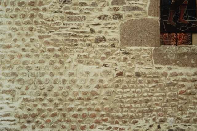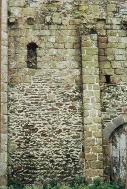 091. Saint-Jean-le-Thomas. The pre-Romanesque choir and its south wall. The choir has similarities with the church Notre-Dame-sous-Terre, present in the innards of Mont Saint-Michel and built by the Benedictines shortly after settling down on the Mont in 966. In both buildings, the bay centerings are made of brick quoins, and walls are made of fairly regular small blocks of granite joined with a thick mortar. Photo by Alain Dermigny. [Alain-045]