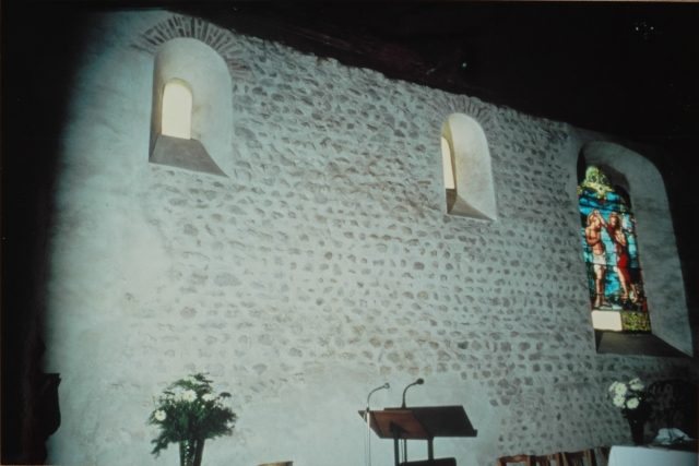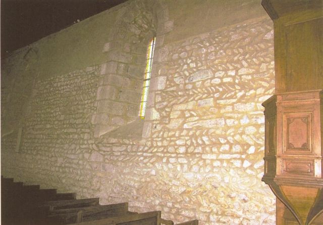125. Dragey. The north wall of the nave (inside). The inner plaster of the side walls was scraped by the villagers to show the opus spicatum (fishbone masonry), at the request of abbot Pierre Danguy, pastor of the church between 1954 and 1974. The opus spicatum — with lines of schist plates arranged horizontally - attests the church was built in the 11th century and early 12th century. The long bay with a deep splay is from the 13th century. Photo by Alain Dermigny. [Alain-067]