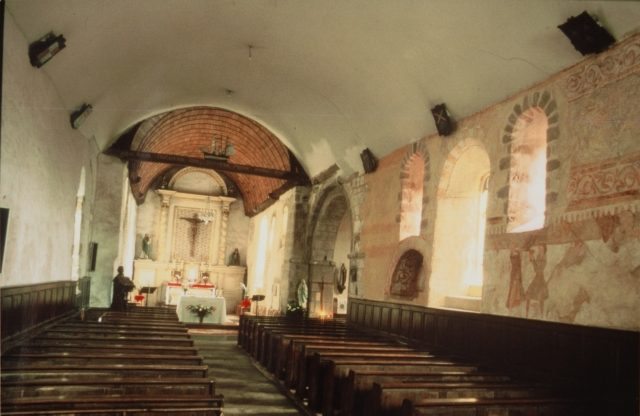 175. Saint-Loup. The church is the only entirely Romanesque building remaining in the region. Built by the lords of Saint-Loup, the church was under St. Loup's patronage. The second saint is St. Gilles. The parish belonged to the deanery of Tirepied and the archidiachoné of Avranches. The nave has three rows. The north and south walls are strenghtened by four buttresses on each side. Three small semi-circular bays are still visible, two in the south wall and one in the north wall. The other bays were opened or enlarged thereafter. The church was granted the title of (French) Historic Monument in 1921. Photo by Alain Dermigny. [Alain-093]