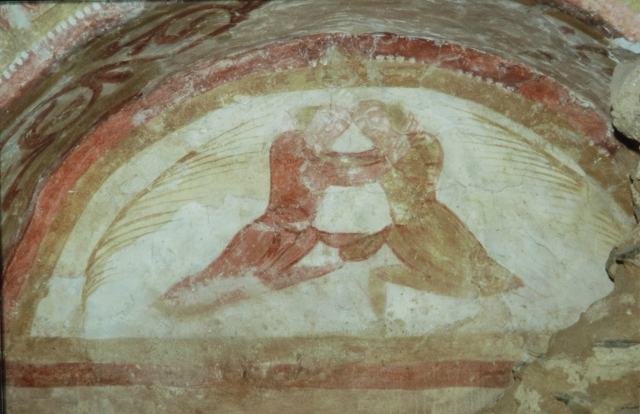180. Saint-Loup. The south wall of the choir. In the first row, the south gate is flanked by two flat buttresses. Between these buttresses, above the gate, the masonry is supported by a cornice with three large carved modillions. The first modillion is a grotesque human being putting his right hand to his mouth while folding his left arm. The second modillion is a human head. The third modillion is a crouched human being, with his hands on his knees. Photo by Alain Dermigny. [Alain-097]