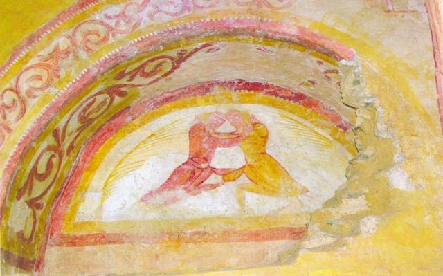 058. Yquelon. The Romanesque vault of the choir. The vault keystones are carved with geometric designs in low relief within a circle. Photo by Claude Rayon. [Claude-16]
