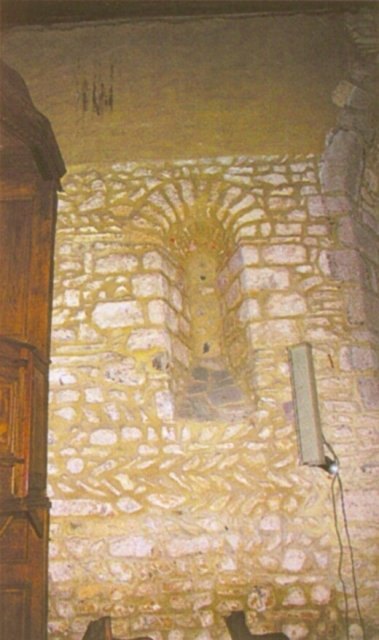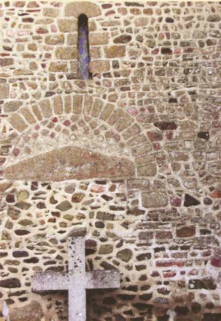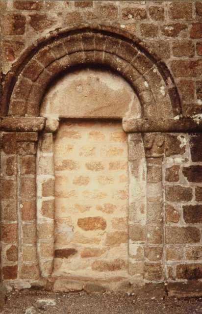 128. Dragey. The north wall of the nave (inside). As the only remaining original bay, this walled-up Romanesque bay has a deep splay, with an arch formed by a row of small granite quoins. Photo by Claude Rayon. [Claude-36]