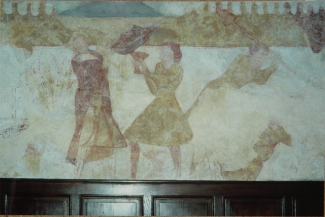 126. Dragey. The north wall of the nave (inside). Villagers patiently scraped the plaster to show the opus spicatum (fishbone masonry), a sign their church was early Romanesque. The inner plaster now only covers the last top quarter of the walls, probably too hard to reach. Photo by Claude Rayon. [Claude-37]