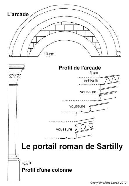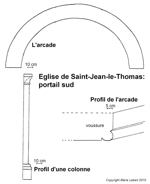207. Sartilly. The Romanesque gate. Sketch of the arch, the archivolt and a column. This gate, which was the west gate of the Romanesque church, is now the south gate of the church that replaced it. Sketch by Marie Lebert.