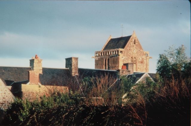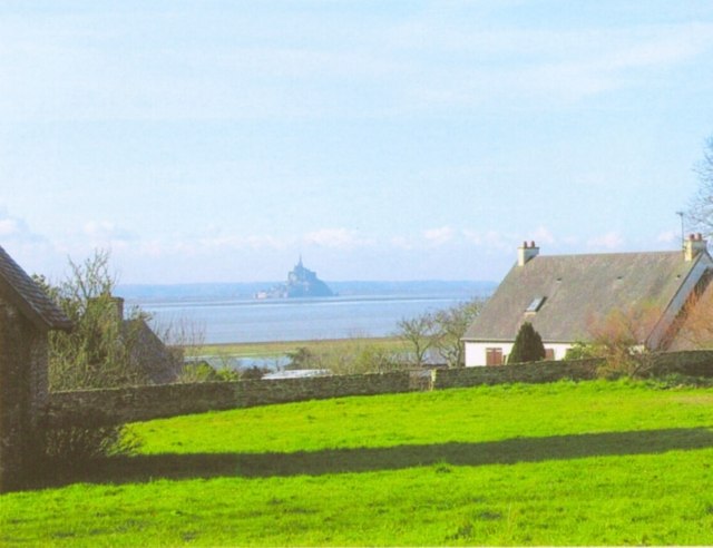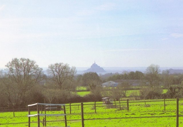158. Saint-Léonard-de-Vains. Spring panorama taken from inside the priory. From there, the Mont Saint-Michel seems to open itself to pilgrims and travellers. Saint-Léonard is a very old village. St. Leonard lived there in the 6th century before being elected the eighth bishop of Avranches in 578. The village was then invaded by the Normans in the 9th century. After the Norman conquest, the village was part of the duke of Normandy's territory, and the fief of the lords of Vains. In 1087, shortly before his death, William the Conqueror gave the priory to the Abbey of Saint-Etienne in Caen. In 1158, Henry II confirmed this donation, which included a mansion, arable lands and vineyards, as well as salines with the right to fish and to collect kelp. Photo by Claude Rayon. [Claude-47]