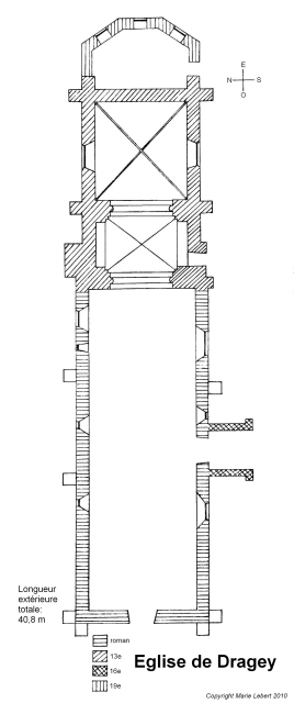 121. Dragey. The church plan. Regularly oriented from west to east, the rectangular building is formed by a three-row nave and a one-row choir. This whole building has an external length of 40,8 meters and an external width of 9,1 meters (width of the front). The tower rises between choir and nave. Plan by Marie Lebert.