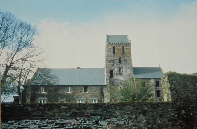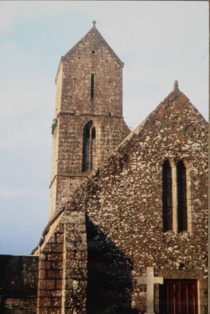 087. Saint-Jean-le-Thomas. The church is under St. John the Baptist's patronage. The parish of Saint-Jean-le-Thomas belonged to the deanery of Genêts and the archidiachoné of Avranches. In 917, William Longsword, second duke of Normandy, gave to the Abbey of Mont Saint-Michel the village of Saint-Jean-at-the-end-of-the-sea with its church, mill, vineyards and meadows. In the 12th century, the duke Robert I gave again to Mont Saint-Michel the seigneury of Saint-Jean and its dependencies. In 1162, the local lord, William of St. John, second founder of the Abbey of the Lucerne, gave to the abbey the church of Saint-Jean-le-Thomas with its dependencies, including many properties around and in England. In the 15th century, the church was still owned by the Abbey of the Lucerne, the abbot of the Lucerne being the lord of the church. Photo by Claude Rayon. [Claude-28]