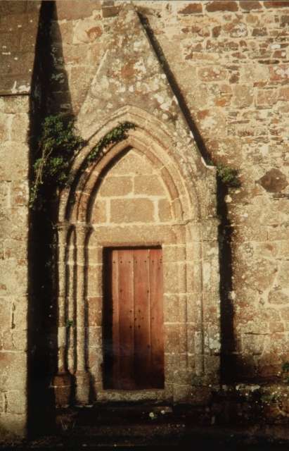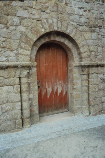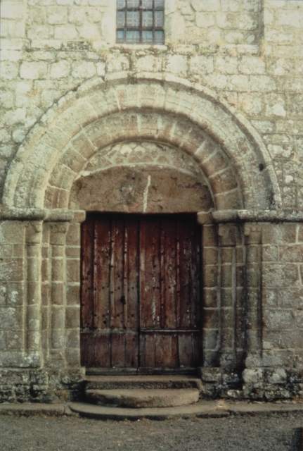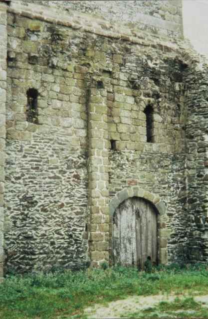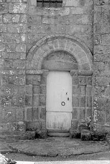 030. Bréville. The Romanesque gate in the south base of the tower. The archivolt topping the semi-circular arch rests on a granite stone carved with a human head. Photo by Alain Dermigny. [Alain-014]