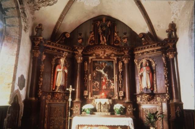 037. Bréville. The main altar, situated in the apse of the choir, with a statue of Our Lady on the left - the church is under her patronage - and a statue of St. Helier - the second saint - on the right. Photo by Alain Dermigny. [Alain-020]