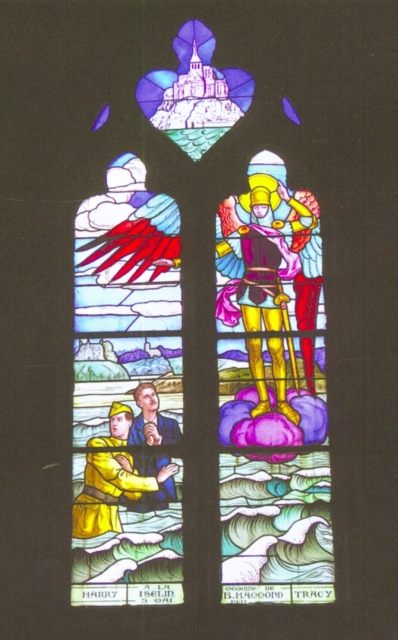 131. Dragey. The stained glass window of one large twin bay in the south wall of the nave. This window is an ex-voto recounting one of the many drownings occurring in the region. On 5 May 1921, Harry Iselin, the son of a family of landowners near Dragey, drowned with an American friend, back from walking back from Mont Saint-Michel while crossing its dangerous shores. Photo by Claude Rayon. [Claude-39]