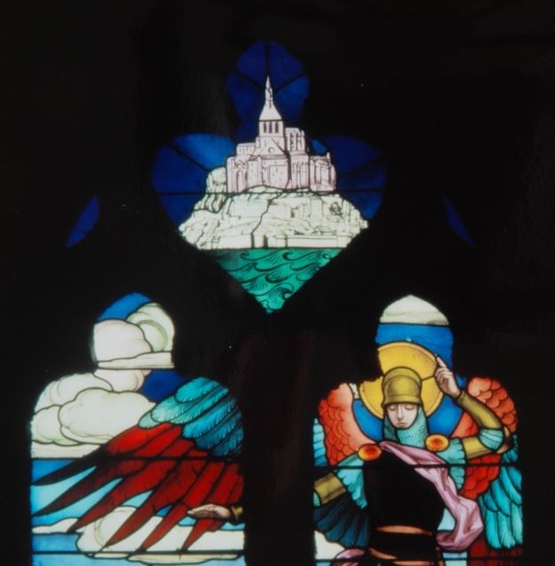 132. Dragey. Detail of the stained glass window. On the top, the Mont Saint-Michel, and below, a partial view of archangel St. Michael. This large twin bay with a trefoil arch replaced in 1860 a rectangular opening, that replaced itself a small Romanesque bay in 1790. This was also the case for the other twin bays. Photo by Alain Dermigny. [Alain-070]
