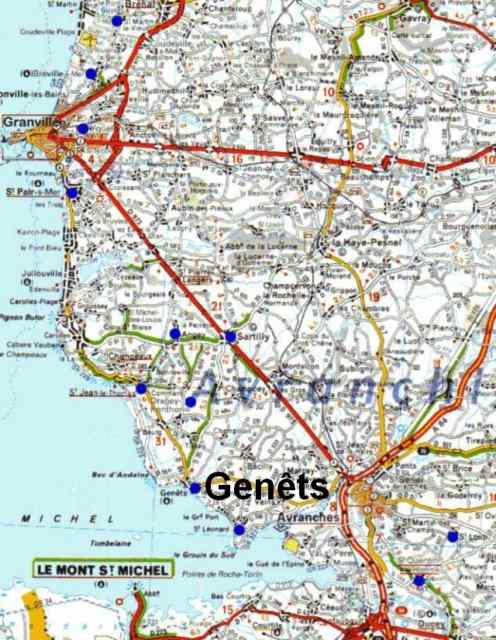 133. Genêts. Location. The village of Genêts is located on the current coastal road between Granville and Avranches, 6 kilometers north of Avranches. The village is facing Mont Saint-Michel, around 4 kilometers far away. The medieval roads used by pilgrims to go to Mont Saint-Michel started from Saint-Pair-sur-Mer, Coutances, Saint-Lô and Caen to reach Genêts. Then they needed to cross dangerous shores to reach Mont Saint-Michel, their final destination. In addition, the shore road between Saint-Pair and Mont Saint-Michel was crossing Bec d'Andaine, near Genêts.