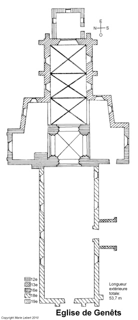 137. Genêts. The church plan. Regularly oriented from west to east, the building is formed by a wide nave, a transept and a three-row choir with a flat apse. The whole building has an external length of 53.7 meters. The external width of the nave is 10.8 meters (width of the front). The first row of the choir opens north and south on two flat apse chapels, that open themselves on the transept arms. Plan by Marie Lebert.