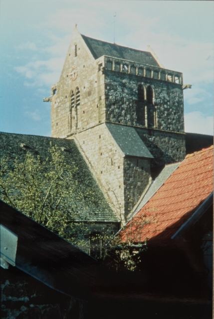 134. Genêts. The village and its church. The church tower - with its saddleback roof, its balustrade and its gargoyles - emerges above the roofs of the village. Genêts is a very old place. It was the tidal port of Avranches, the capital of the region before its looting by the Norman pirates in the 9th century. The barony of Genêts was given in 1022 to the Abbey of Mont Saint-Michel by Richard II, duke of Normandy, as well as the baronies of Saint-Pair and Ardevon. The center of a barony and a deanery, Genêts became an active town under the early Norman dukes. In the early 14th century, there were nearly 3,000 inhabitants, and the church counted seven chapels and a full clergy. This was the most flourishing period. During the Hundred Years War, Genêts was looted, fleeced and burned by the British troops from 1356 on. During the Religion Wars between Catholics and Protestants, Genêts was again sacked in 1562 by the troops of the Protestant Montgomery. During the French Revolution, Genêts lost its juridiction of a seneschal, its sergentery, its deanery, its fairs and its markets, and went from being a town to being a village. The county town became Sartilly. Photo by Alain Dermigny. [Alain-083]