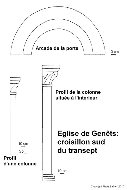 144. Genêts. The gate in the south transept. This heavy and simple gate is from 11th century, with semi-circular plain grains and thick columns. It probably belonged to the building that was prior to the Romanesque church consecrated in 1157. The semi-circular arch is formed of two thick non-molded grains. The external grain rests on two thick attached columns topped by a square chamfered abacus, which goes on as a chamfered band on the wall. The capital basket is carved with barely visible angle hooks. The outside ground level is now at the same level as the start of the column trunk. The square base is topped by a double torus is below ground level. Photo by Alain Dermigny. [Alain-077]