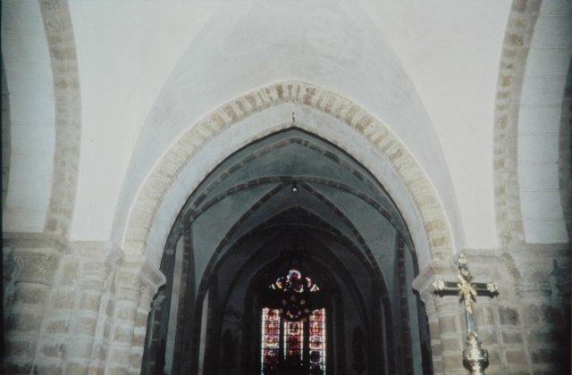 147. Genêts. The Romanesque transept crossing. The piers support four thick slightly triangular arches that surround the groin vault above the transept crossing. Photo by Alain Dermigny. [Alain-079]
