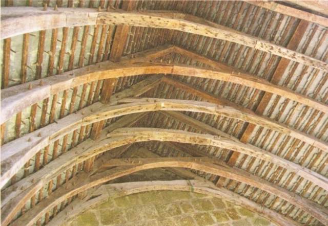 056. Yquelon. The Romanesque vault of the choir. The very large ribs are adorned with two thick angular tori surrounding a small triangular molding. This Romanesque ribbed vault was probably one of the first ribbed vaults in Normandy. Photo by Alain Dermigny. [Alain-032]