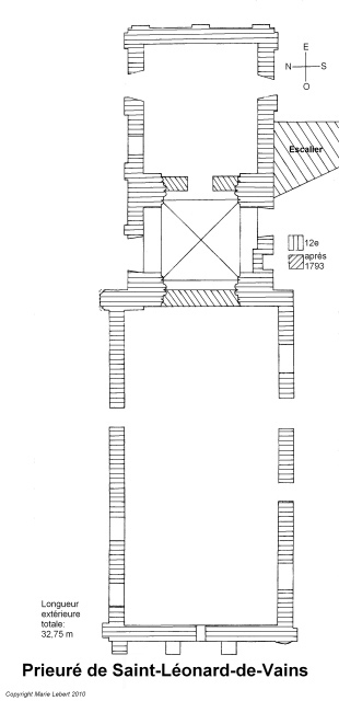 165. Saint-Léonard-de-Vains. The plan of the priory church. Regularly oriented from west to east, the building is formed of a nave and a two-row choir with a flat apse. The whole building has an external length of 32.75 meters and an external width of 9.65 meters (width of the front). The tower rises between choir and nave. Plan by Marie Lebert.