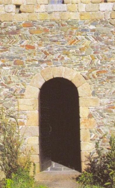 172. Saint-Léonard-de-Vains. The base of the Romanesque tower, and its gate with its semi-circular arch and abutments in granite. The opus spicatum (fishbone masonry) of the masonry is a sign the church is early Romanesque. Photo by Claude Rayon. [Claude-52]