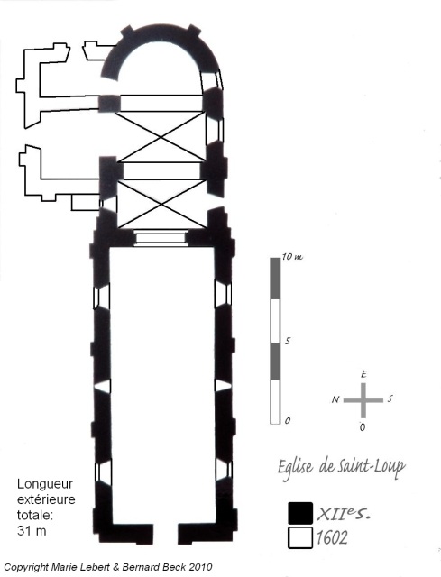 176. Saint-Loup. The church plan. Regularly oriented from west to east, the building is formed by a two-row nave and a three-row choir with a semi-circular apse. The whole building has an external length of 31 meters and an external width of 8.2 meters (width of the front). The tower rises above the first row of the choir. The north side chapel along the second row of the choir was added in 1602 by the lords of Saint-Loup. Plan by Marie Lebert and Bernard Beck.