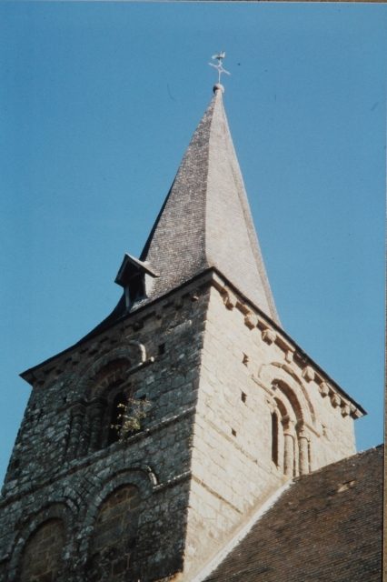067. Saint-Pair-sur-Mer. The Romanesque tower is square, and its two floors are topped by an octogonal spire. A group of two blind arches adorn the first floor, at the north and south. Large twin bays adorn the second floor on all four sides. Divided by a small column with a square abacus and a square base, these twin bays are topped by a semi-circular arch molded with a simple torus and resting on attached columns. Photo by Alain Dermigny. [Alain-035]