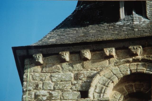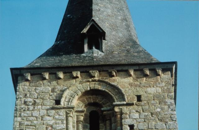 168. Saint-Léonard-de-Vains. The Romanesque tower. On three sides - north, east and south - the second floor is adorned with two twin semi-circular arches, with a double grain formed by two rows of granite quoins. The arch rests on plain abutments through a square abacus, that goes on as an horizontal band along the wall. The cornice is supported by modillions carved with rough human heads or molded in quarter-round. Photo by Alain Dermigny. [Alain-090]
