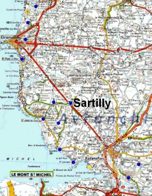 202. Sartilly. Location. The town of Sartilly is located on the road between Granville and Avranches, 15 kilometers south of Granville and 11 kilometers north of Avranches. Sartilly was on the medieval road going from Saint-Lô to Mont Saint-Michel, the final destination for many pilgrims. The parish of Sartilly belonged to the deanery of Genêts and the archidiachoné of Avranches. The church is under St. Pair's patronage.