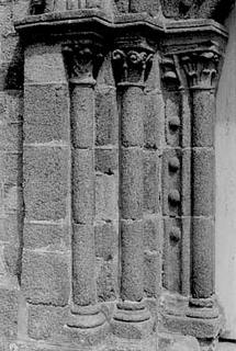 209. Sartilly. The Romanesque gate. The left columns. On each side of the gate, the three grains rest on three attached columns through an impost molded with a cavetto. The square part of the impost is adorned with a small hollow molding. The impost goes on above the external pier supporting the archivolt. Photo by Alain Dermigny. [Alain-113]