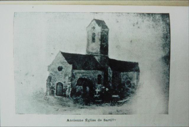 205. Sartilly. The old Romanesque church, demolished in 1858, in a drawing from the journal Revue de l'Avranchin dated 1924-1926. This church was described in the Minute Book of the City Council (Registre des Délibérations du Conseil Municipal) of Sartilly of 1837-1864: "The church we should replace is an old building (...) composed of: 1) a dark nave which is 19 meters and 60 centimeters long and 7 meters wide, with the lower part of its walls soaked with moisture and cracked in several places, and not standing straight anymore, particularly towards the end of the church; 2) a tower between the nave and the choir (...); 3) a choir which is 9 meters long and 6 meters wide (...)." Photo by Alain Dermigny. [Alain-118]