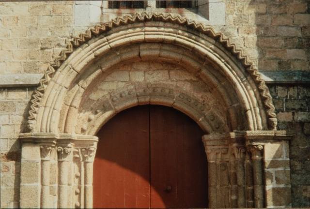 178. Saint-Loup. The Romanesque west gate. Its semi-circular arch is formed of two grains surrounded by a archivolt, which is a chamfered band. Each grain has the following moldings: a thick angle torus, a listel, a shallow cavetto and a row of carved hollow saw-teeth. The grains rest on four attached columns. Molded in quarter-round, the capital abaci go on as an horizontal band along the wall. The baskets are carved with rough sculptures: angle hooks or angle heads whose features were erased with the test of time. The square bases are adorned with a torus topping a chamfer carved with barely visible small claws. They rest on a small stone wall going on along the whole length of the front. The lintel is a big monolith block of granite, and it is topped by an opus reticulatum (diamond-shaped masonry) of diamond-shaped stones. Photo by Alain Dermigny. [Alain-095]