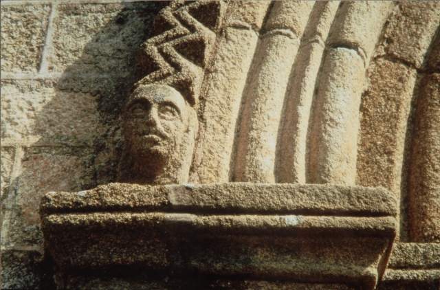 210. Sartilly. The Romanesque gate. The left side of the archivolt. The archivolt is formed by a band adorned with saw-teeth in high relief carved with a row of triangular sticks. On either side of the arch, it rests on a head carved in the granite. Photo by Alain Dermigny. [Alain-114]