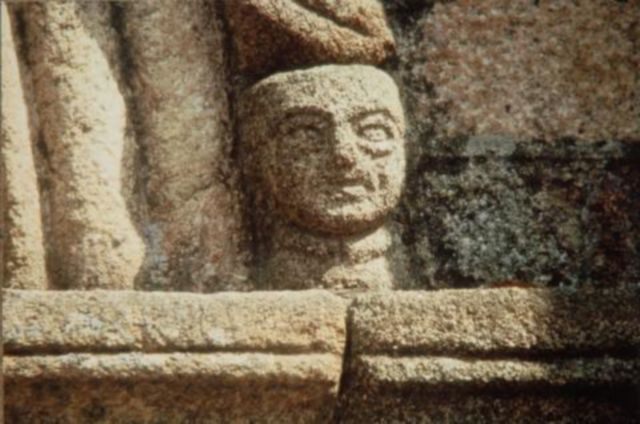 213. Sartilly. The Romanesque gate. The right side of the archivolt. Detail showing the same carved head, closer. Photo by Alain Dermigny. [Alain-117]